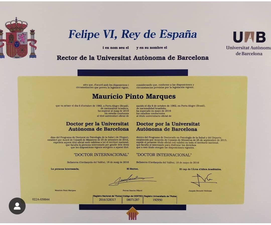 Uma vez formado, em 2008 se mudou para Barcelona, Espanha, onde permaneceu 4 anos. Lá estudou em um dos maiores centros da área, a Universitat Autònoma de Barcelona, em que realizou um Mestrado Europeu, seguido pelo Doutorado em Psicologia do Esporte com a menção de PhD Internacional.