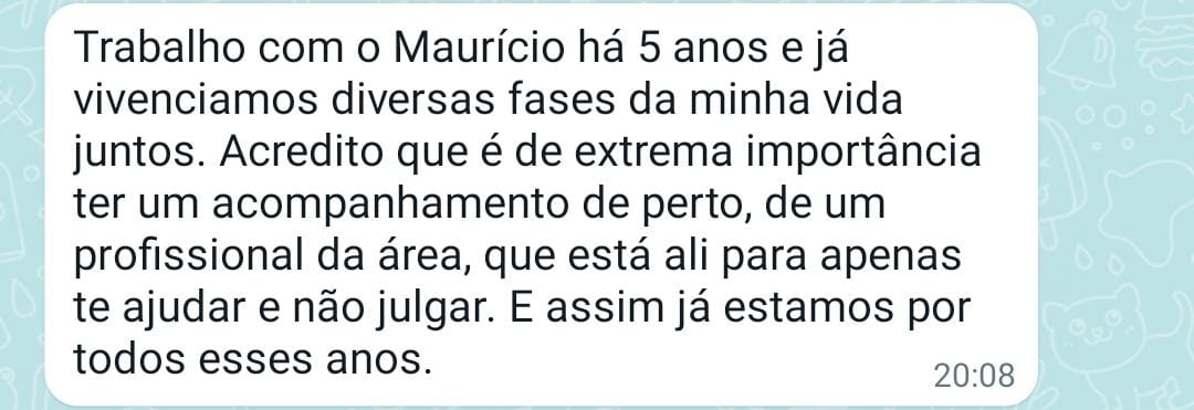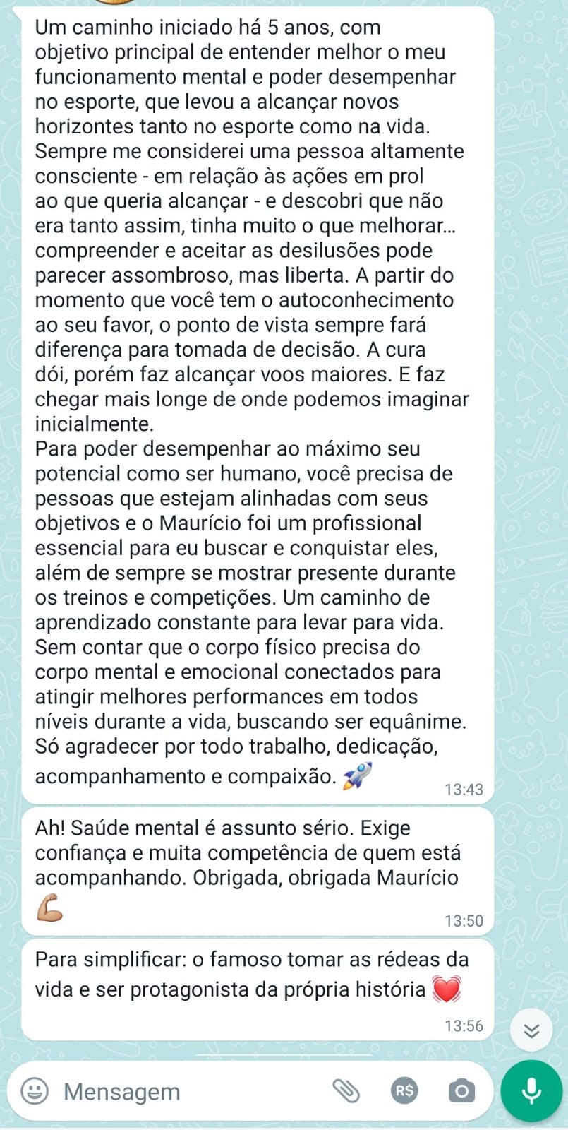 Através do método científico, mas com uma linguagem simples, escuta acolhedora e estratégias de treinamento psicológico para adolescentes e adultos que buscam performar em alto rendimento, Maurício garante um acompanhamento ativo e interativo, instrumentalizando o atleta e não só analisando situações passadas silenciosamente.